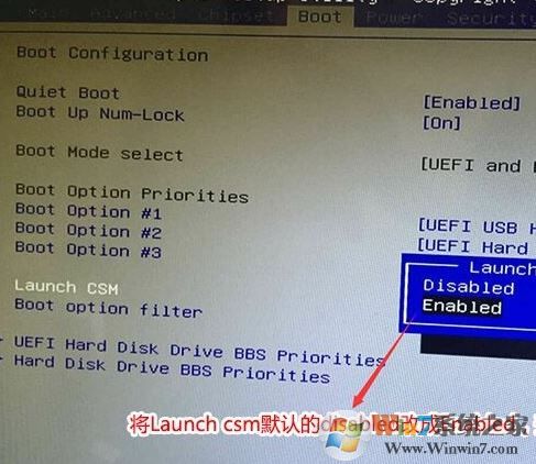 3、再將launch csm設(shè)置為Enabled,開(kāi)啟兼容模式,如下圖所示,然后再F4保存設(shè)置;