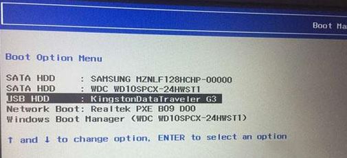 5、插入制作好的U盤啟動(dòng)盤,重啟按F12或FN+F12調(diào)出啟動(dòng)管理對話框,選擇USB HDD識別到U盤啟動(dòng)進(jìn)入PE,回車,如圖所示:
