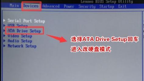 4、切將鍵盤移動(dòng)Devices選項(xiàng),把鍵盤移動(dòng)ATA Drive Setup回車,將configure SATA as中默認(rèn)的raid改成ahci模式,否則安裝win7時(shí)會(huì)出現(xiàn)0x0000007b藍(lán)屏,因?yàn)閣in7中沒有集成raid硬盤驅(qū)動(dòng),然后選擇F10保存設(shè)置,在彈出的選項(xiàng)中選擇YES,如下圖所示;