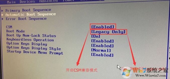 3、切換到Boot,把Boot Mode從UEFI改成Legacy only引導(dǎo)模式,再把csm默認(rèn)disabled改成enabled,開啟兼容模式,選擇F10保存設(shè)置,在彈出的選項(xiàng)中選擇YES;