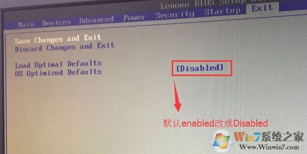 2、轉(zhuǎn)到Exit,把OS Optimized Defaults設(shè)置為Disabled,改成支持win7系統(tǒng)模式,如下圖所示;