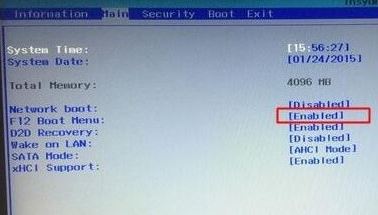 4、轉(zhuǎn)到Main,選擇F12 Boot Menu回車,設(shè)置為Enabled,按F10選擇Yes回車保存修改,如下圖所示;