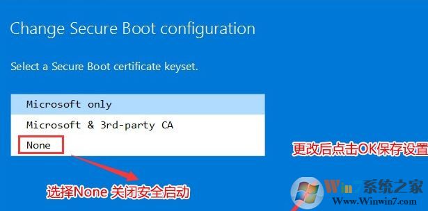 3、返回到security(安全選項(xiàng))上,進(jìn)入進(jìn)入右側(cè)的change configuration進(jìn)入安全啟動(dòng)設(shè)置,然后將secure boot configuration改成noe關(guān)閉安全啟動(dòng)(安裝WIN7系統(tǒng)一定要關(guān)閉),如下圖所示;