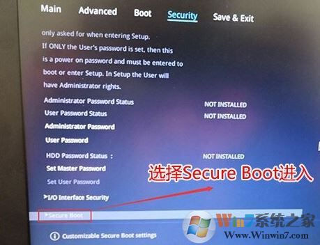 2、進(jìn)入高級模式后,按→方向鍵移動到Security,選擇Secure Boot,然后回車進(jìn)入把Secure Boot control選enabled改為disabled關(guān)閉安全啟動,裝win7必須關(guān)閉安全啟動,如下圖所示;