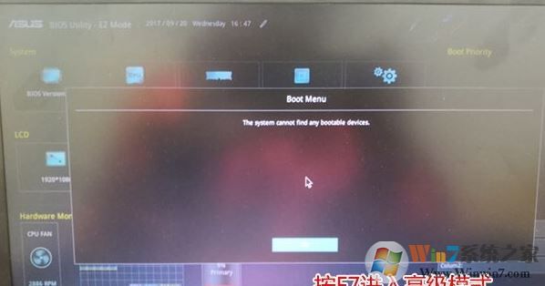 1、重啟筆記本一直按esc進(jìn)入BIOS界面,然后按F7進(jìn)入高級模式進(jìn)行裝win7相關(guān)的設(shè)置,不設(shè)置安裝win7后也無法啟動,如下圖: