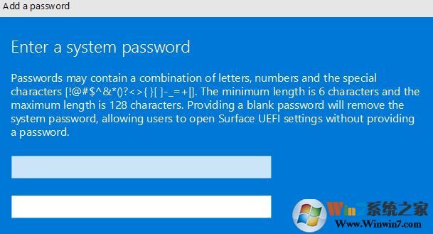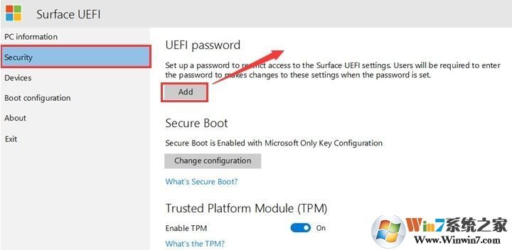 2、進(jìn)入BIOS界面后,我們首先往下移到security(安全選項(xiàng))上,在右側(cè)的uefi password增加密碼,在將 Surface 設(shè)備啟動到 UEFI 時,必須輸入此密碼。 密碼可包含以下字符:大寫字母:A-Z 小寫字母:a-z 特殊字符: ! @# $%^ & * () ? <>{}[]-_ = + |。,;: '"密碼必須最少為 6 個字符,并且區(qū)分大小寫,如下圖所示;