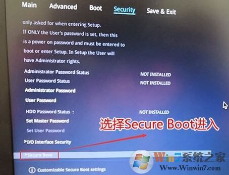 2、進(jìn)入高級(jí)模式后,按→方向鍵移動(dòng)到Security,選擇Secure Boot,然后回車進(jìn)入把Secure Boot control選enabled改為disabled關(guān)閉安全啟動(dòng),裝win7必須關(guān)閉安全啟動(dòng),如圖: