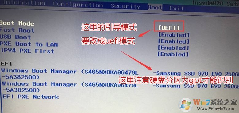 4、切換到Boot,把Boot Mode從引導模式改成uefi(這里引導必須為uefi,如果采用legacy模式安裝,BIOS中無法認別新加的三星970硬盤,這樣就無法正常從三星970 evo硬盤引導啟動,如果你只是把三星970硬盤當成從盤就可以用legacy模式)如圖: