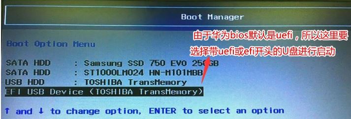 4、以上操作完成后,我們接著按鍵盤上的F10保存設(shè)置,然后將制作好的U盤啟動盤(一定要記得必須要支持uefi啟動的U盤)接到電腦上按F12,接著我們會看到啟動菜單,我們選擇帶uefi或efi開頭的U盤“回車”啟動,如圖: