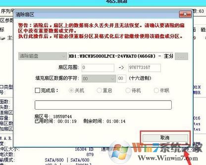 4,接著就會開始清除扇區(qū)數(shù)據(jù),一般硬盤容量越大,清除的時間越長,但我們這里不用等清除完成,可以到清除1-2分鐘后點取消后即可,如下圖所示: