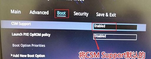 3、再切換到BOOT的選項(xiàng),把CSM support由disabled改成enabled,開啟兼容模式,如下圖所示;