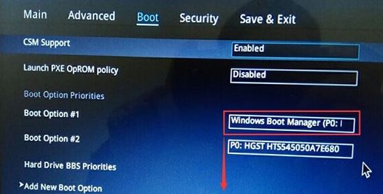 4、繼續(xù)把boot option#1選項(xiàng)改為普通引導(dǎo)的,boot option#1和boot option#2硬盤啟動(dòng)位置對(duì)換,設(shè)置第一啟動(dòng)項(xiàng)為普通硬盤引導(dǎo),帶Windwos Boot Manager的為UEFI引導(dǎo)分區(qū),然后按F10保存設(shè)置;