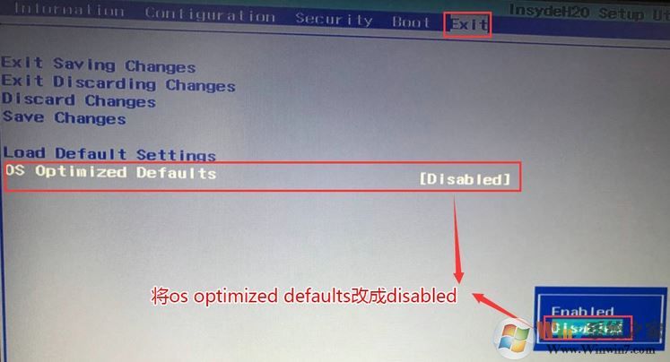 3、轉(zhuǎn)到Exit,把OS Optimized Defaults設(shè)置為Disabled或Other OS;