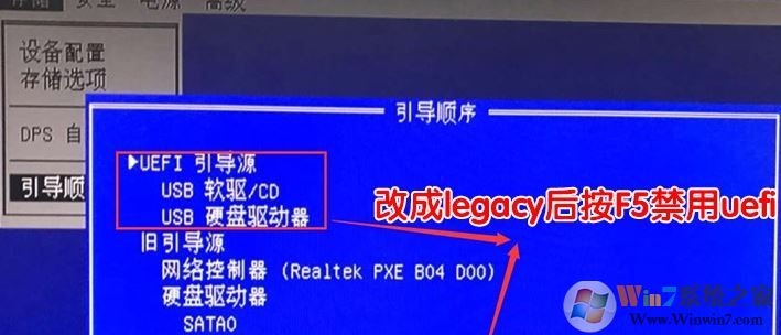 3、然后進(jìn)入存儲(chǔ)選項(xiàng),然后選擇引導(dǎo)順序,如果我們改成legacy舊支持后,這里進(jìn)入后按F5禁用uefi引導(dǎo)源,如下圖所示;