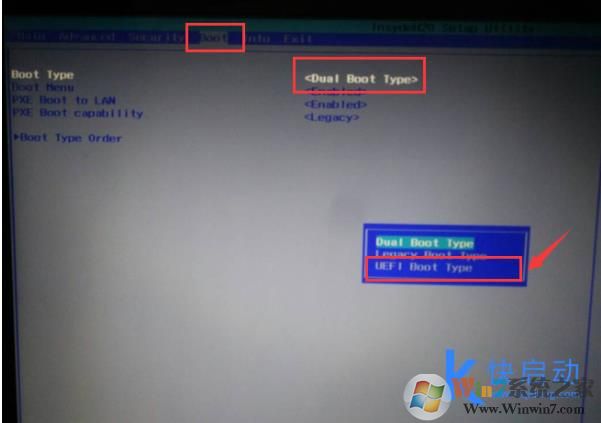5、在下面的BIOS下,把Boot Type設(shè)置為UEFI Boot Type;