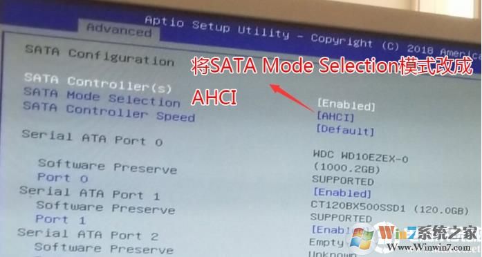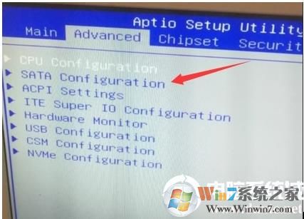2、進入BIOS后,我們首先將鍵盤的方向往右移,切換到Advanced高級選項中,找到SATA Configuration回車進入,將SATA Mode Selection硬盤模式改成AHCI,否則如果用raid模式,進入PE后找不到硬盤,,如下圖所示;