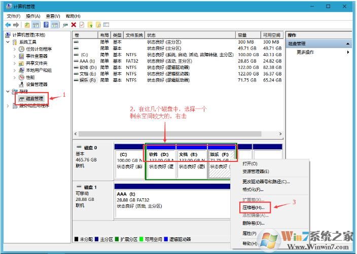 2、在計(jì)算機(jī)管理中,打開磁盤管理,如下圖; 右鍵點(diǎn)擊一個(gè)空間比較大的磁盤,選擇壓縮卷;