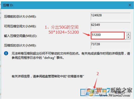 3、輸入一個(gè)合適的空間大小,點(diǎn)擊壓縮。(從可用磁盤中分一外區(qū)出來安裝CentOS)