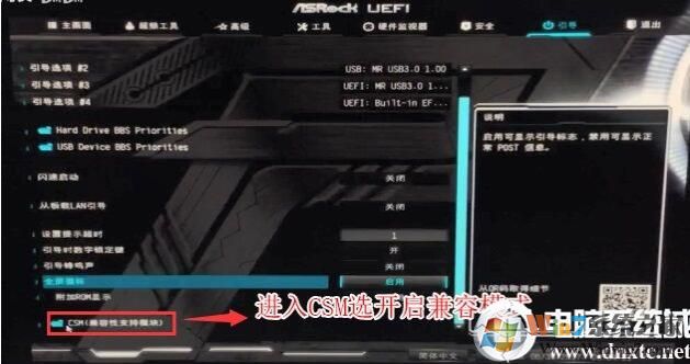 3、再鍵盤方向鍵右鍵切換到"引導(dǎo)"選項(xiàng),進(jìn)入csm菜單開啟“兼容模式”,如下圖所示;
