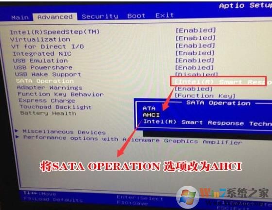 1、開機(jī)一直按F2進(jìn)入BIOS,按F2進(jìn)入BIOS界面,切換到Advanced的選項(xiàng),把SATA Operation選項(xiàng)改成AHCI,如圖所示;