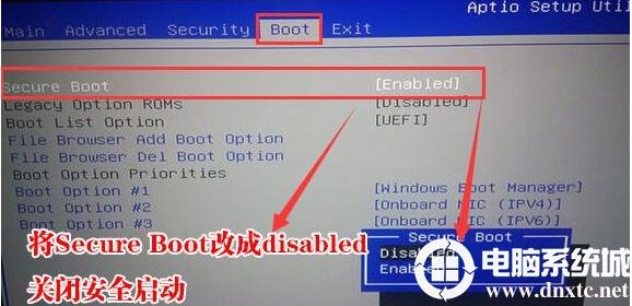 2、再切換到BOOT頁面,選擇secure Boot按回車改成Disabled,如圖所示;