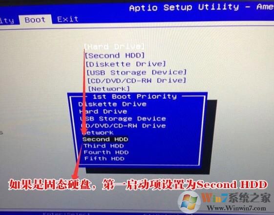 4、改完后再BOOT第一啟動(dòng)項(xiàng),如果有固態(tài)硬盤將選擇Second HDD 為第一啟動(dòng)項(xiàng),如果選擇機(jī)械盤啟動(dòng)系統(tǒng)的加就選擇Hard Devive ,如下圖所示;