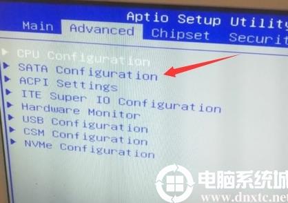 2、進(jìn)入BIOS后,我們首先將鍵盤的方向往右移,切換到Advanced高級選項(xiàng)中,找到SATA Configuration回車進(jìn)入,將SATA Mode Selection硬盤模式改成AHCI,否則如果用raid模式,進(jìn)入PE后找不到硬盤,,如下圖所示;