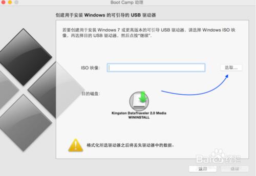 5、在“ISO映像”選擇剛才下載的win7 ISO鏡像文件的路徑,“目的磁盤”選擇你插入的U盤,點繼續(xù)。(Win7鏡像可以事先拷貝到蘋果電腦桌上,或是放在另一個U盤中)