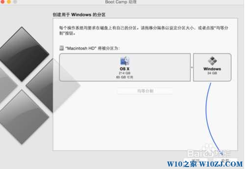 6、U 盤安裝盤制作完成以后,會進入 Mac 硬盤的分割界面。在這里可以手動調(diào)整會 Windows 系統(tǒng)的硬盤空間。建議分配空間不少于 50G。硬盤大的可以多分一點,畢竟我們大多都用windows還要安裝軟件程序;
