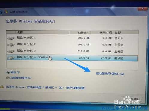 9、跳過一些步驟我們來到“你想將Windows安裝在何處”界面,選擇bootcamp分區(qū)并點擊“驅(qū)動器高級”選項,如圖所示