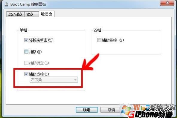 4、Boot Camp支持軟件也就是驅(qū)動是必須安裝的,MACBook安裝成Win7后,觸摸板需要到右下角的Boot Camp中進行設(shè)置開啟輔助點擊。