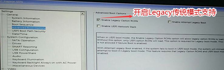 2、切換到Advanced Boot Options將右邊的Enable legacy option roms選項(xiàng)打勾,如圖: