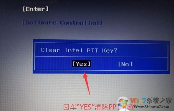 注:按如果Security選項(xiàng)下沒有Secure Boot選項(xiàng),看下是否有"clear intel PTT Key"選項(xiàng),如果有進(jìn)入回車選選擇“yes”清除ppt key,否則無(wú)法安裝系統(tǒng)后無(wú)法引導(dǎo)啟動(dòng),如下圖所示;