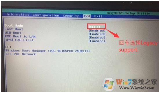 4、切換到Boot,把Boot Mode從UEFI改成Legacy Support傳統(tǒng)引導(dǎo),部分機(jī)器也可以采用uefi安裝,但保險(xiǎn)點(diǎn)還是改成傳統(tǒng)模式,如下圖所示;