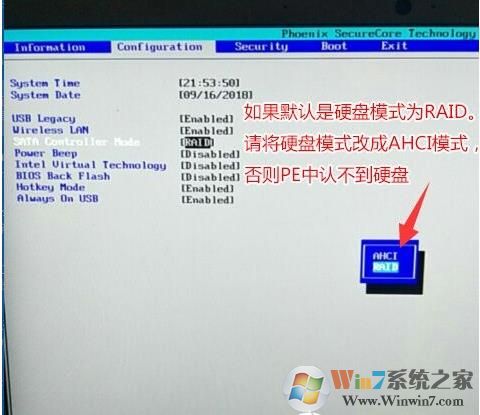 6、注意:再返回configuration這項(xiàng),查看sata controller mode這項(xiàng),如果默認(rèn)硬盤模式為RAID或RST模式,請(qǐng)將硬盤模式改為AHCI模式,否則進(jìn)PE后不能認(rèn)出硬盤,如果更改后記得按F10保存,如下圖所示;