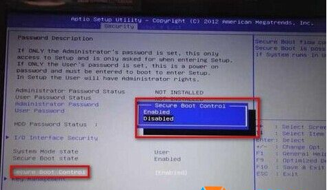 2、我們點(diǎn)擊SETUP進(jìn)入到BIOS,然后左右鍵定位到Security頁面,找到Secure BOOT Control,回車將Enabled改為Disabled,如下圖;