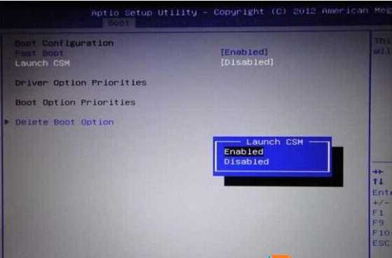 3、然后我們先按F10保存并退出BIOS,重啟后繼續(xù)按ESC鍵,這時(shí)候啟動(dòng)菜單還是沒有的,同樣還不能看到U盤,再次進(jìn)入到BIOS后,我們切換到BOOT頁面,把Launch CSM改為Enabled,OK,還是按F10保存并重啟。