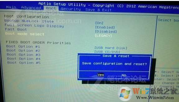 3、敲回車之后會(huì)出現(xiàn)一個(gè)框框,框里有三個(gè)選項(xiàng),選擇legacy這一模式,然后 回車鍵位,接著f10保存退出。