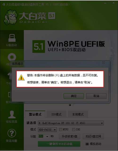 按鈕,程序會(huì)提示是否繼續(xù),確認(rèn)所選U盤無重要數(shù)據(jù)后開始制作: