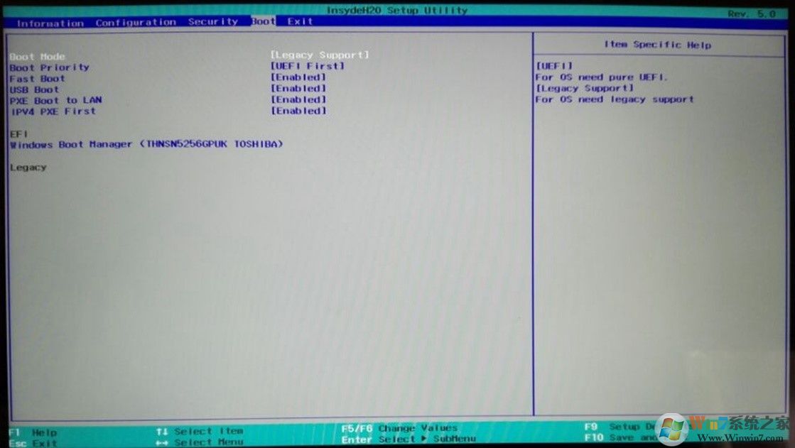 5、按左右方向鍵找到Boot選項(xiàng)→看到第一項(xiàng)Boot Mode [Legacy Support]選項(xiàng)后回車。