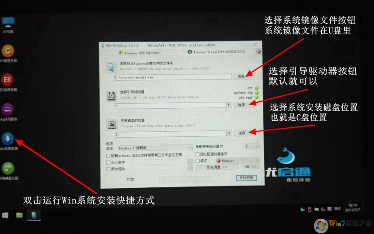 10、進(jìn)入“優(yōu)啟通PE”系統(tǒng)桌面→運(yùn)行Win系統(tǒng)安裝器快捷方式→先打開“此電腦”確認(rèn)一下各分區(qū)盤符及U盤盤符→選擇Win鏡像文件→引導(dǎo)驅(qū)動(dòng)器默認(rèn)就可以不用選→選擇系統(tǒng)安裝磁盤路徑也就是C盤位置→點(diǎn)擊“開始安裝”按鈕。