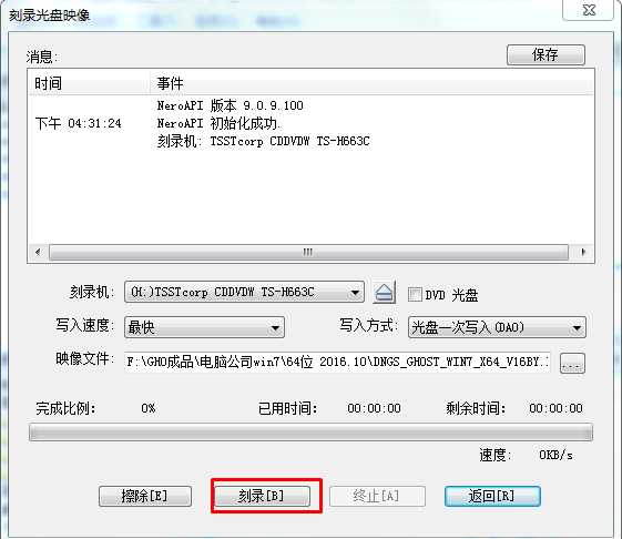 5、放入“空白刻錄光盤”然后點擊【刻錄】按鈕,即可開始刻錄;