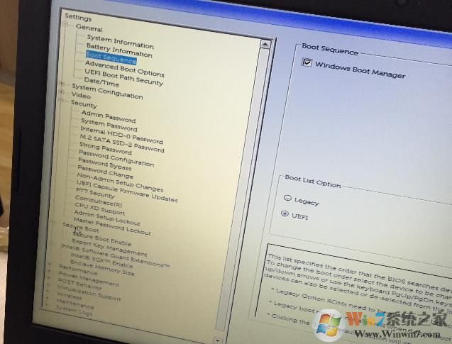 4、然后選中 boot sequence 設置為legacy 并去掉上面 Windows boot manager選項(如果想使用uefi方式安裝win7則不用管)