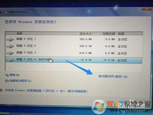 10、進(jìn)入到Win7安裝程序后,下一步下一步之后,來到系統(tǒng)分區(qū)界面,這時(shí)需要注意。在安裝系統(tǒng)分區(qū)界面里,選擇bootcamp分區(qū)并點(diǎn)擊“驅(qū)動(dòng)器高級(jí)”選項(xiàng),如圖所示