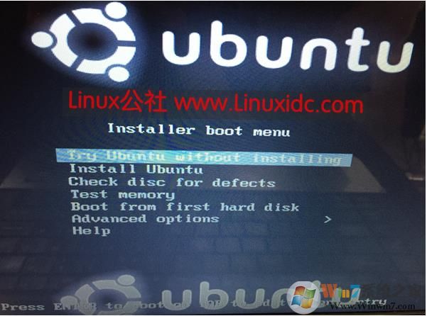 2、啟動后就會出現(xiàn)這個畫面,選擇第一選項 Try Ubuntu without installing 或 第二選項 Install Ubuntu 直接安裝。
