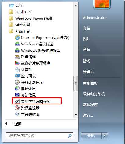 1、打開開始菜單→所有程序→附件→系統(tǒng)工具,然后選擇打開專用字符編輯程序;