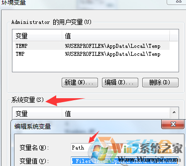 4、選中系統(tǒng)變量中的path,點擊編輯按鈕,m.cncxm.com win7系統(tǒng)之家 添加path并保存即可。