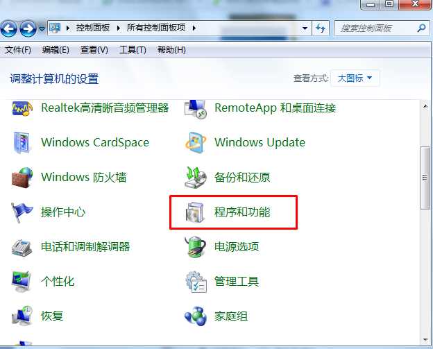 2、打開控制面板后,我們要選擇大圖標方式或小圖標方式查看,就可以看到程序和功能了;