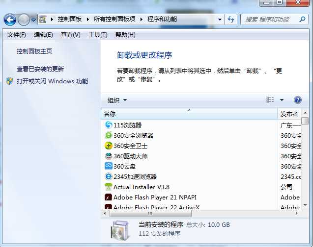 PS:在程序和功能中,我們可以管理并卸載第三方軟件,還可以在打開或關(guān)閉Windows功能中管理系統(tǒng)自帶程序。