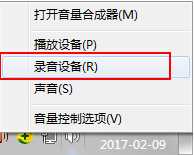 1、首先我們右擊任務(wù)欄右下角的“喇叭”圖標(biāo),點(diǎn)擊“錄音設(shè)備”;